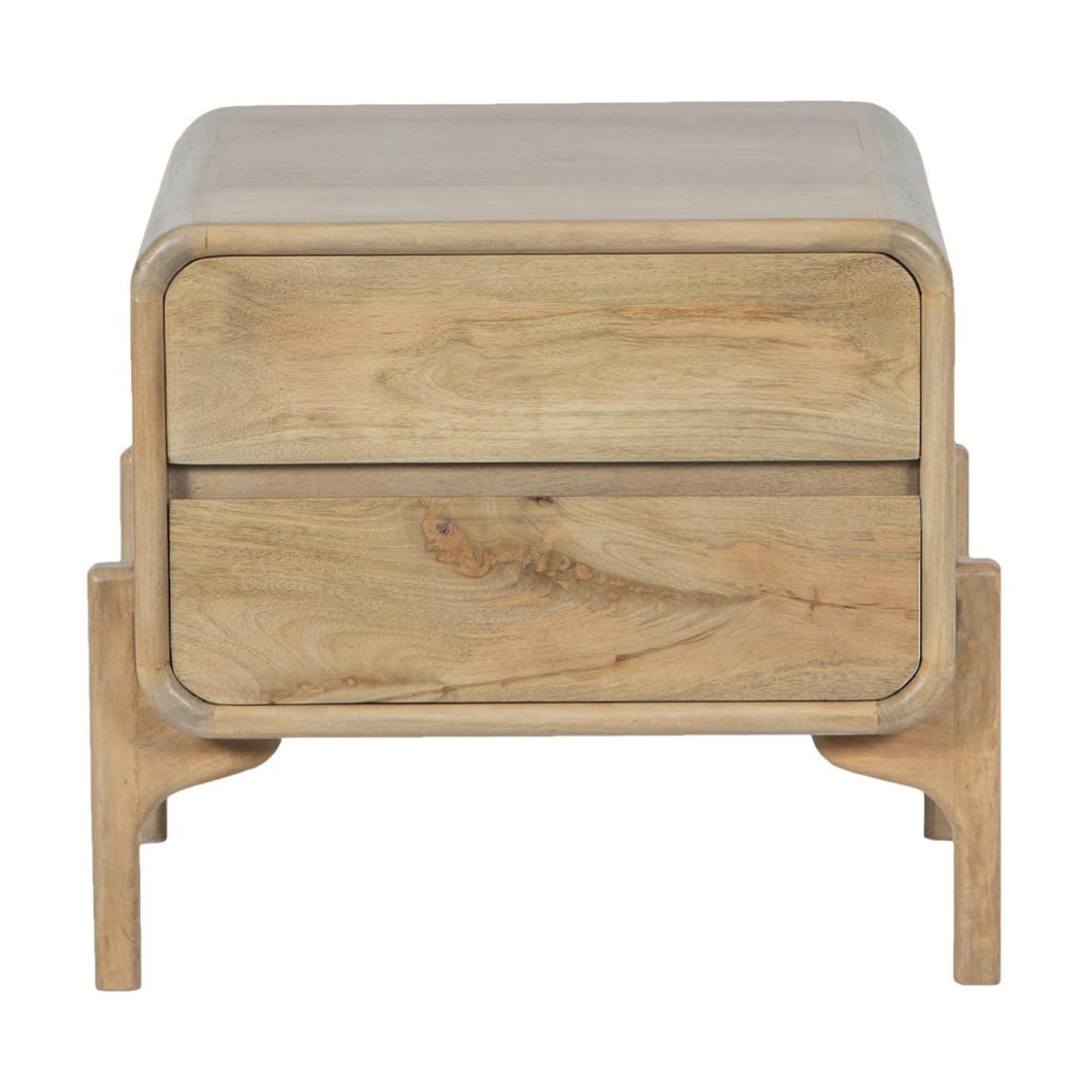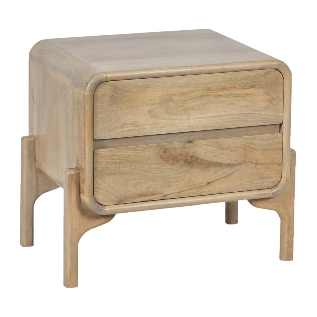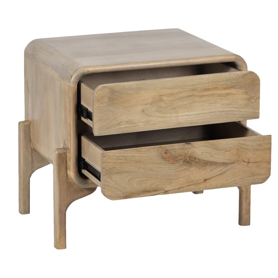 Solid mango wood nightstand with two drawers.