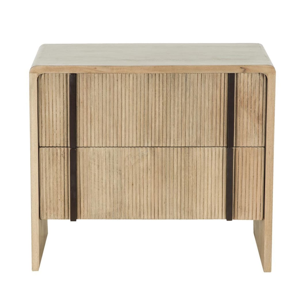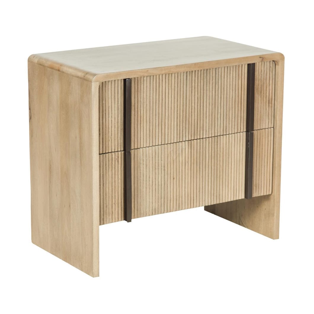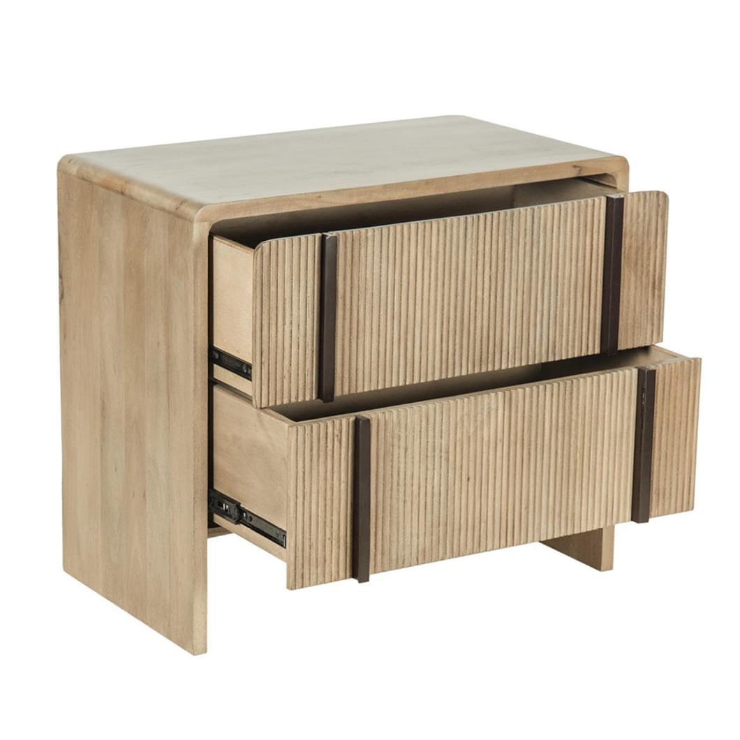 The Montauk nightstand is made of solid mango wood and features a warm, natural grain that will bring organic charm to a space, while steel accents ensure durability. With two spacious drawers, it offers ample storage for essentials and is perfectly sized to sit beside your bed. Its understated silhouette makes it versatile enough to complement a variety of décor styles. Pairs well with the Montauk console.