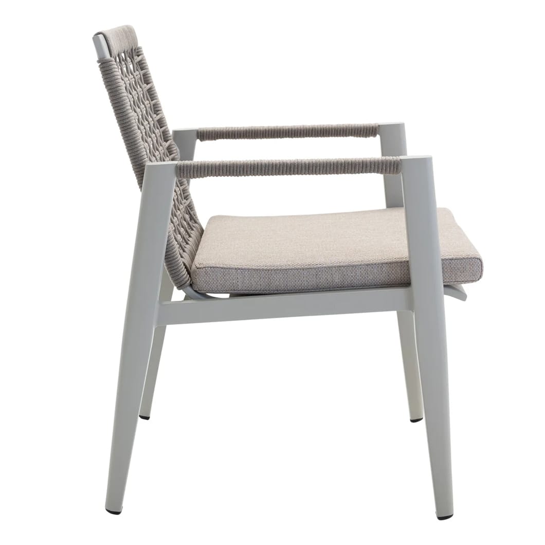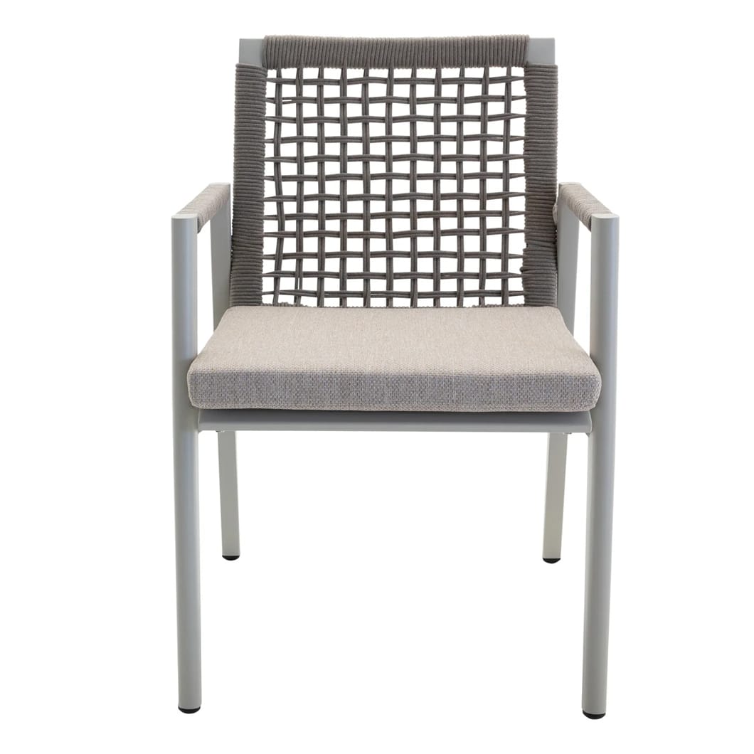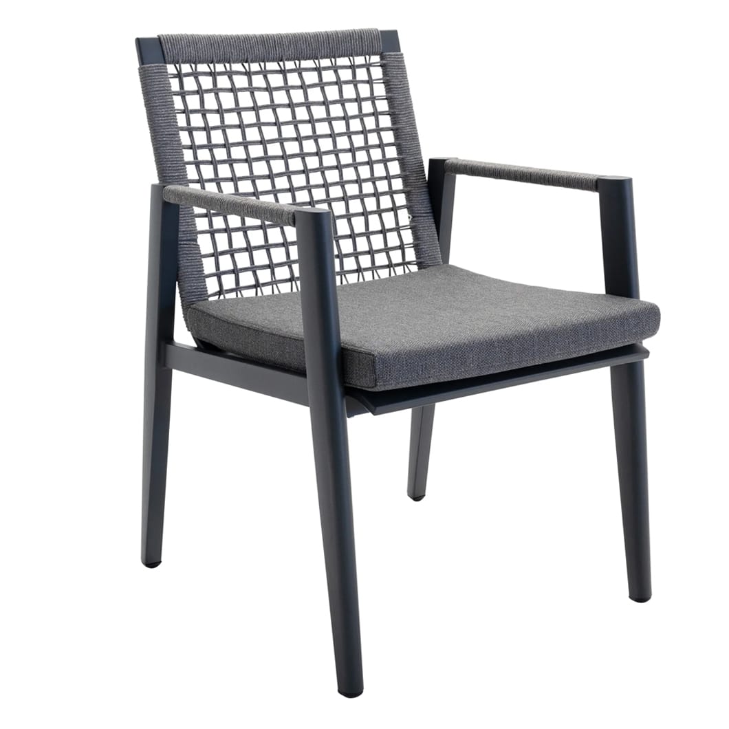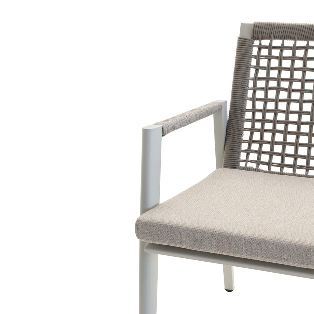 Take your seat in the sun with the Vista dining chair, a wicker-style seater that will bring comfort and a sense of casual elegance to any outdoor area. An aluminium frame secures it against the effects of the elements, as does a woven UV-resistant rope and outdoor cushion. Available in two shades.